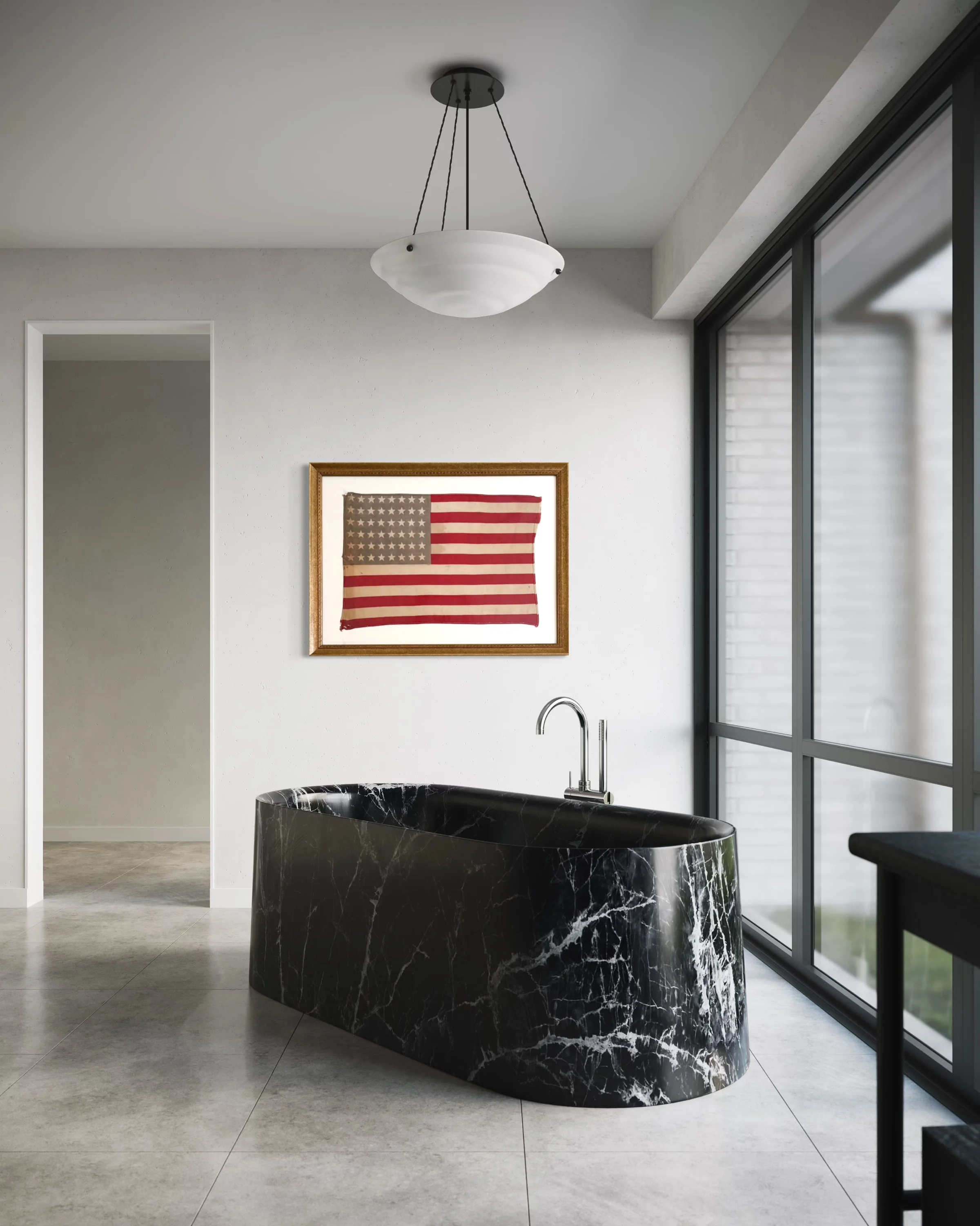 An antique, tattered and faded 48-star American flag. Dates to the 1920s. Made of linen. UV protective, reduced glare glass and acid-free matting.